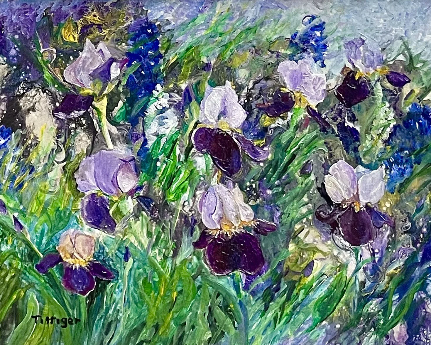 IRISES IN THE WIND 20” X 24”. This is an acrylic pour with irises and delphinium painted over it. Reminds me of my grandmother’s flowers. This is framed. $400.00.